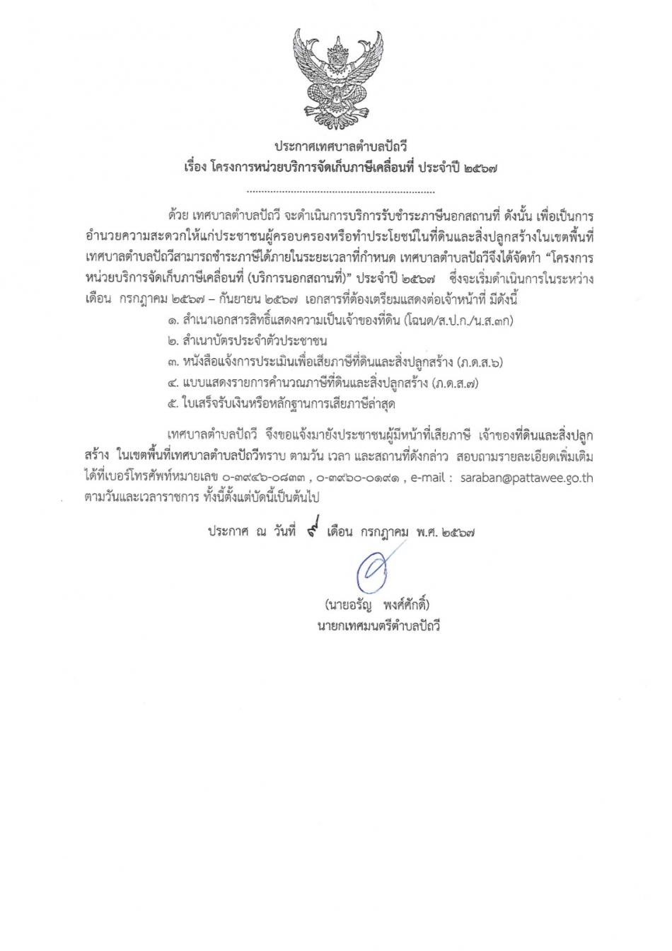 ประกาศเทศบาลตำบลปัถวีขอแก้ไขแผนการดำเนินการตามโครงการหน่วยบริการจัดเก็บภาษีเคลื่อนที่ ประจำปี 2567 เพิ่มเติม [16 กรกฎาคม 2567]