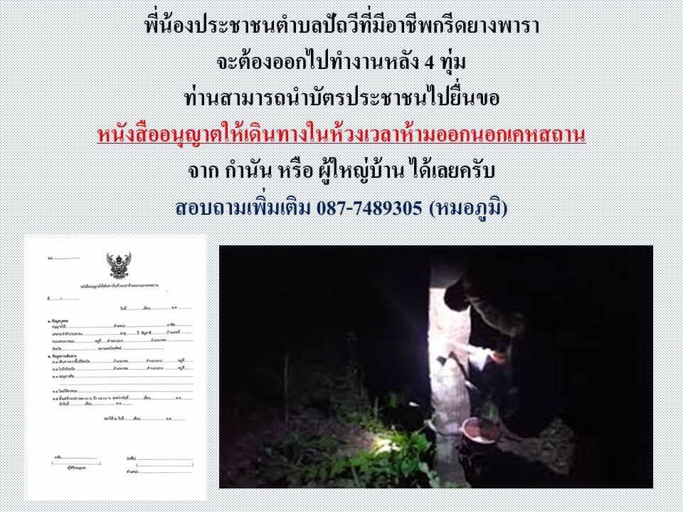 ประกาศสำหรับพี่น้องประชาชนตำบลปัถวี ที่มีอาชีพทำสวนยางพารา สามารถนำนำบัตรประชาชนไปยื่นขอหนังสืออนุญาตให้เดินทางในห้วงเวลาห้ามออกนอกเคหสถานจากกำนัน-ผู้ใหญ่บ้านได้เลยค่