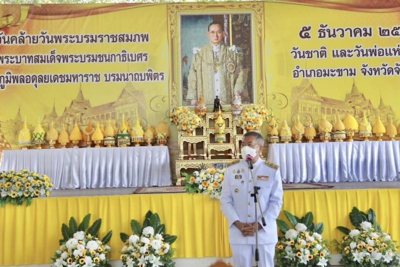 เวลา 08.00 น. โดยมีพิธีถวายพานพุ่มราชสักการะหน้าพระบรมฉายาลักษณ์พระบาทสมเด็จพระปรมินทรมหาภูมิพลอดุลยเดช บรมนาถบพิตร โดยมีนายวีระ พวงภู่ นายอำเภอมะขาม เป็นประธานในพิธี ณ ศาลาประชาคมอำเภอมะขาม