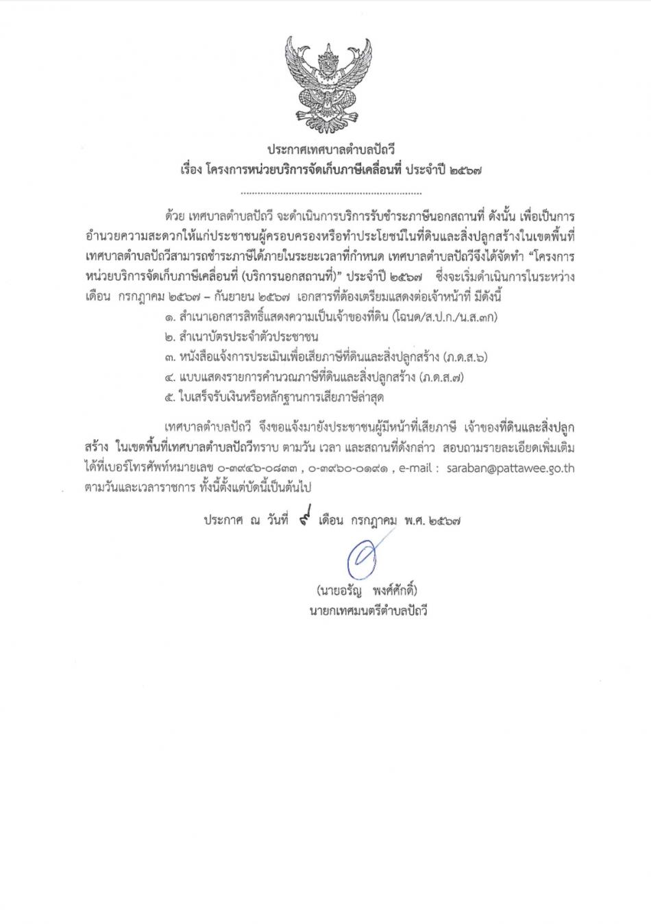ประกาศเทศบาลตำบลปัถวี เรื่องโครงการหน่วยบริการจัดเก็บภาษีเคลื่อนที่ ประจำปี 2567 [13 กรกฎาคม 2567]