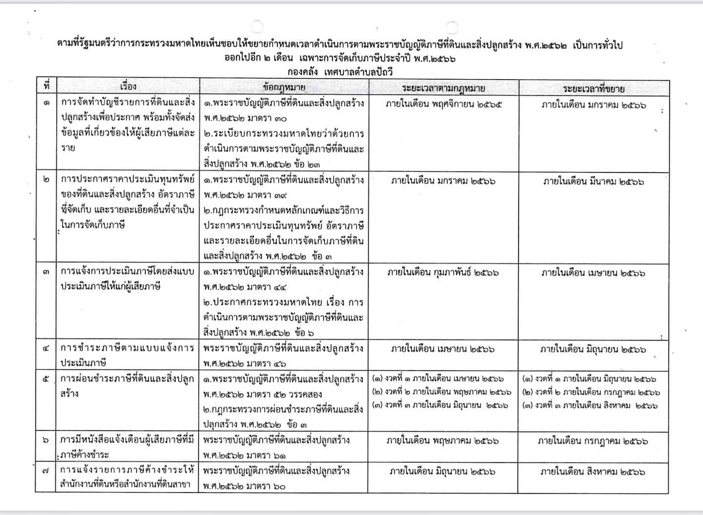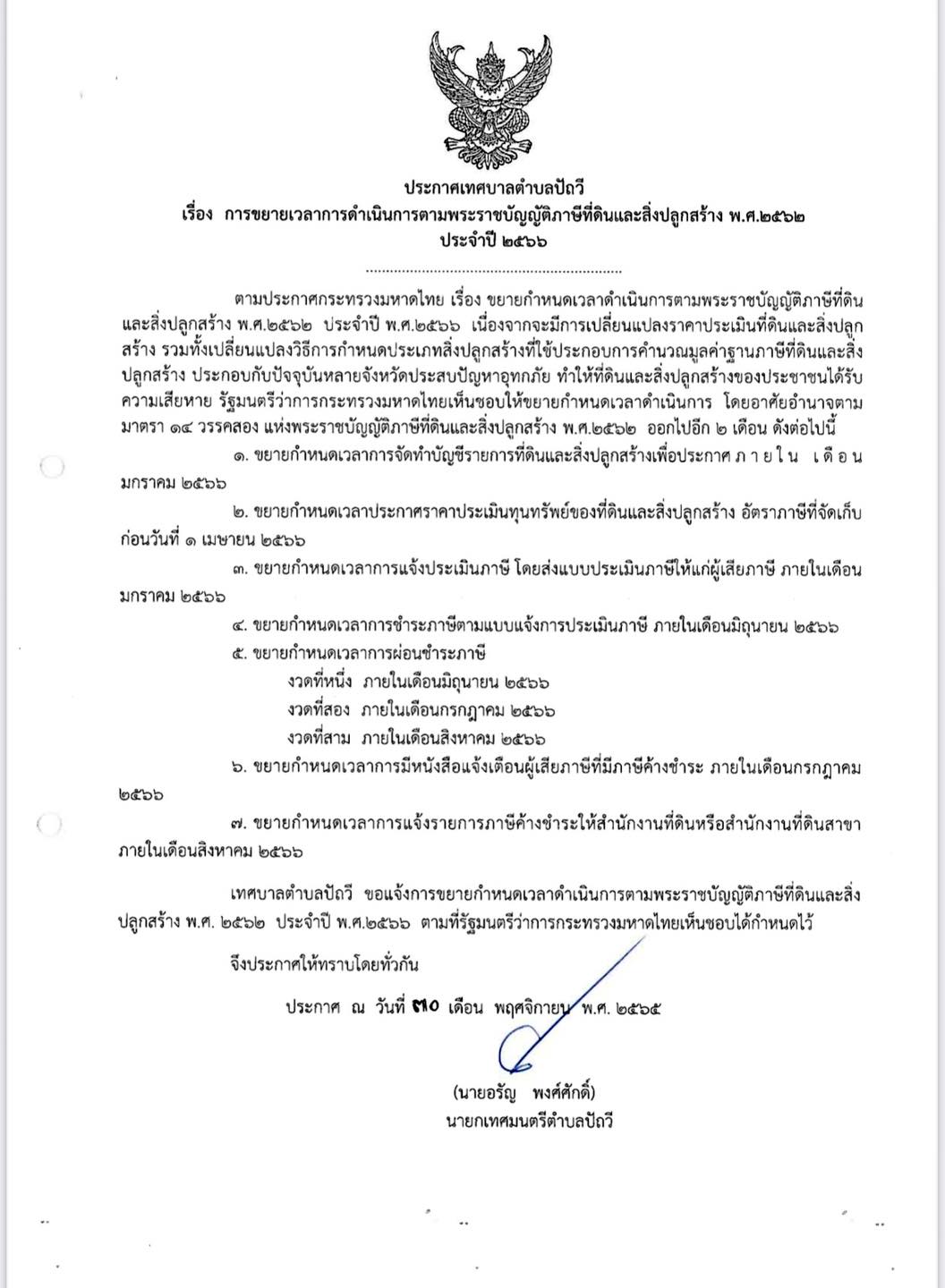 ประกาศเทศบาลตำบลปัถวี เรื่อง การขยายเวลาการดำเนินการตามพระราชบัญญัติภาษีที่ดินและสิ่งปลูกสร้าง พ.ศ.2562 ประจำปี2566